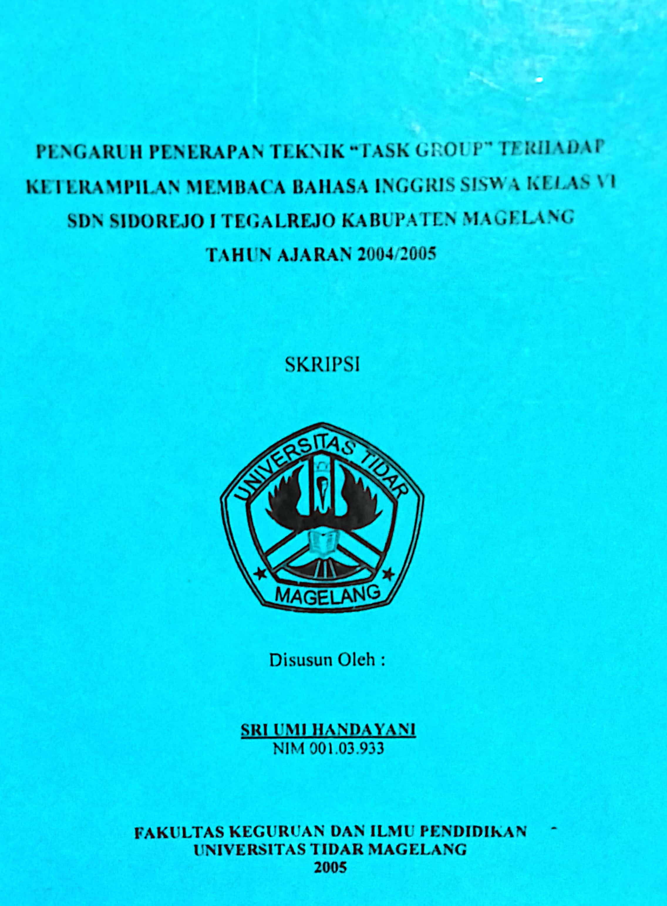 SKRIPSI PENGARUH PENERAPAN TEKNIK "TASK GROUP" TERHADAP KETERAMPILAN MEMBACA BAHASA INGGRIS SISWA KELAS VI SDN SIDOREJO I TEGALREJO KABUPATEN MAGELANG TAHUN AJARAN 2004/2005