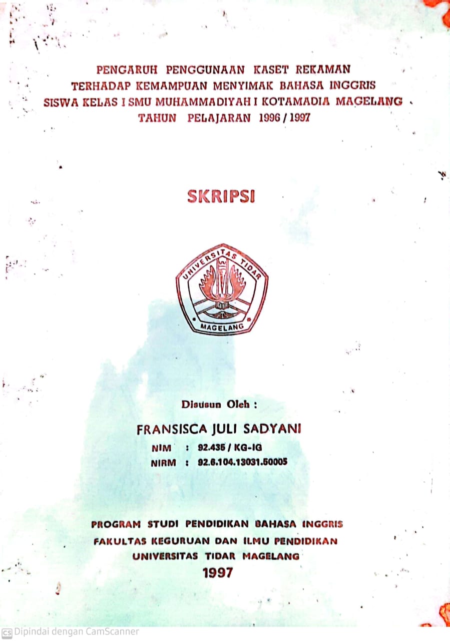 SKRIPSI PENGARUH PENGGUNAAN KASET REKAMAN TERHADAP KEMAMPUAN MENYIMAK BAHASA INGGRIS SISWA KELAS I SMU MUHAMMADIYAH KOTAMADIA MAGELANG TAHUN PELAJARAN 1996 / 1997